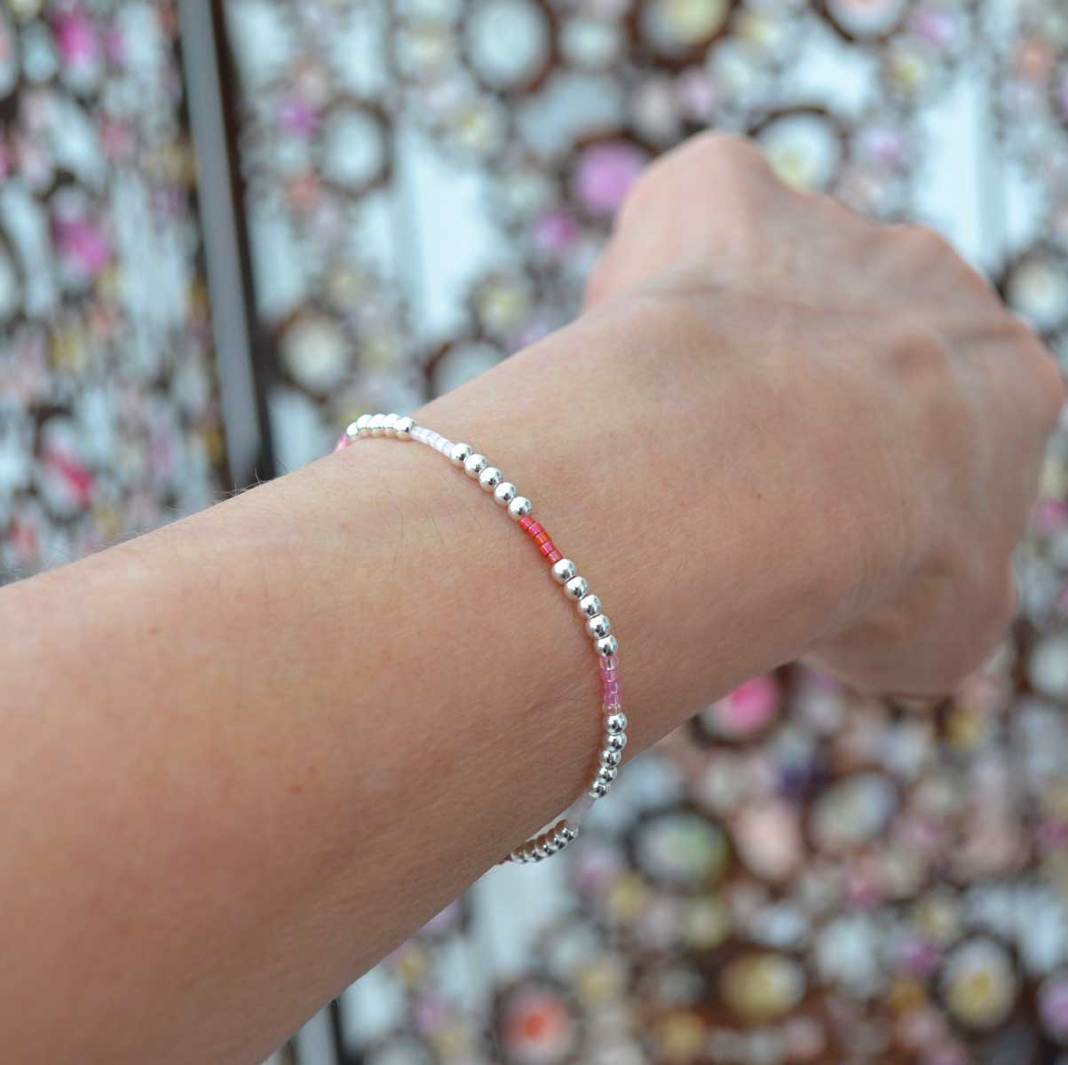 Assemblé dans mon atelier, sur un fil en silicone hautement résistant, sans fermoir.