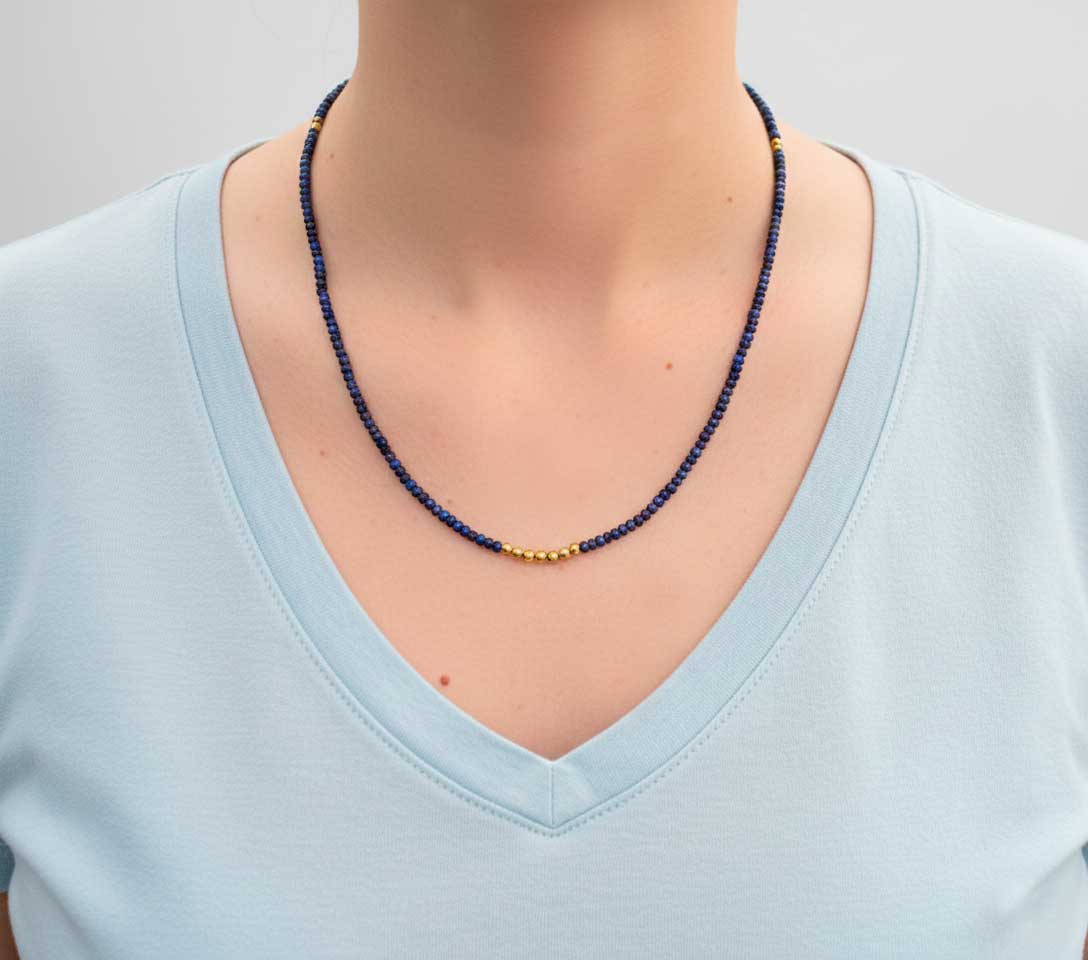 Le bracelet Eos en Lapis Lazuli unit la profondeur apaisante de la pierre bleue à la lumière dorée de l’hématite plaquée or 18k.