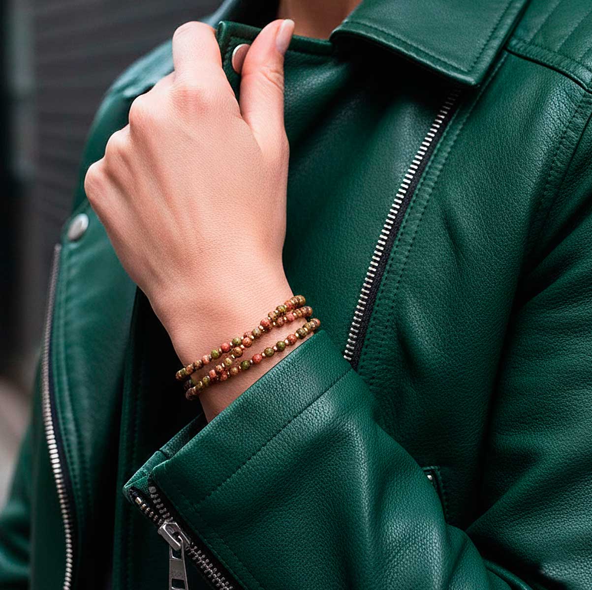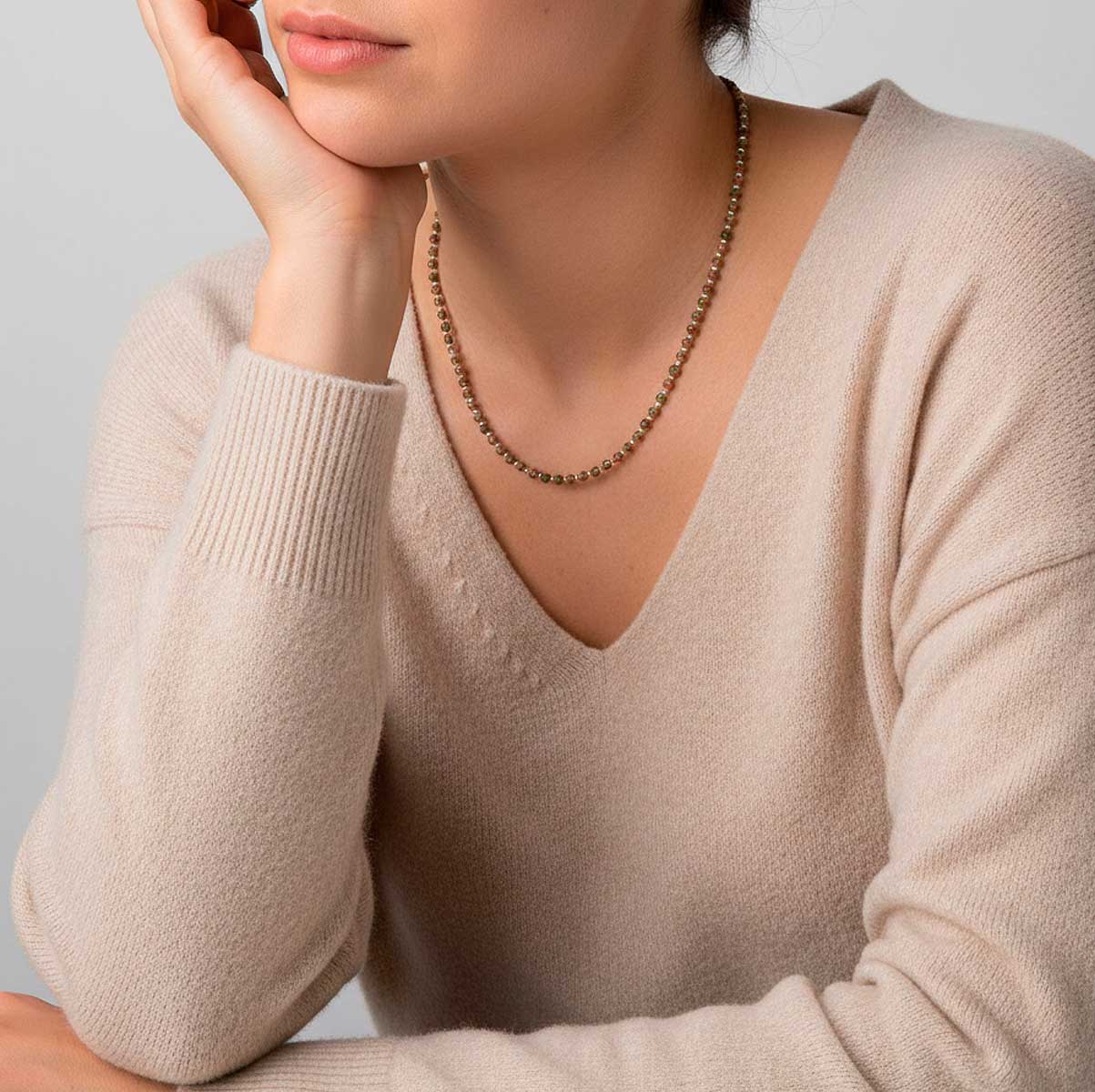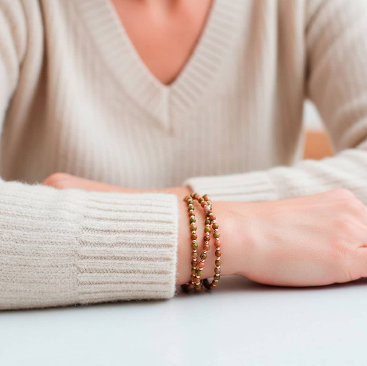 Les teintes naturelles de l’Unakite se marient à la lumière dorée rose des perles japonaises, créant une harmonie moderne et apaisante.