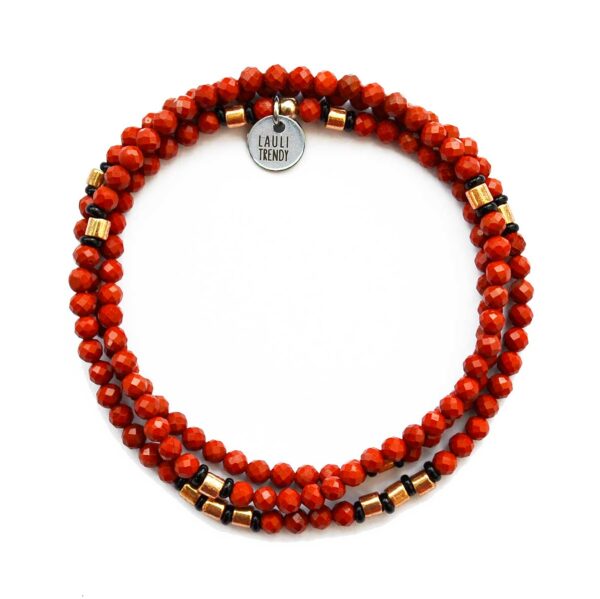 Ses perles naturelles de Jaspe rouge diffusent vitalitรฉ et audace, tandis que les perles japonaises ajoutent une touche subtile de lumiรจre.