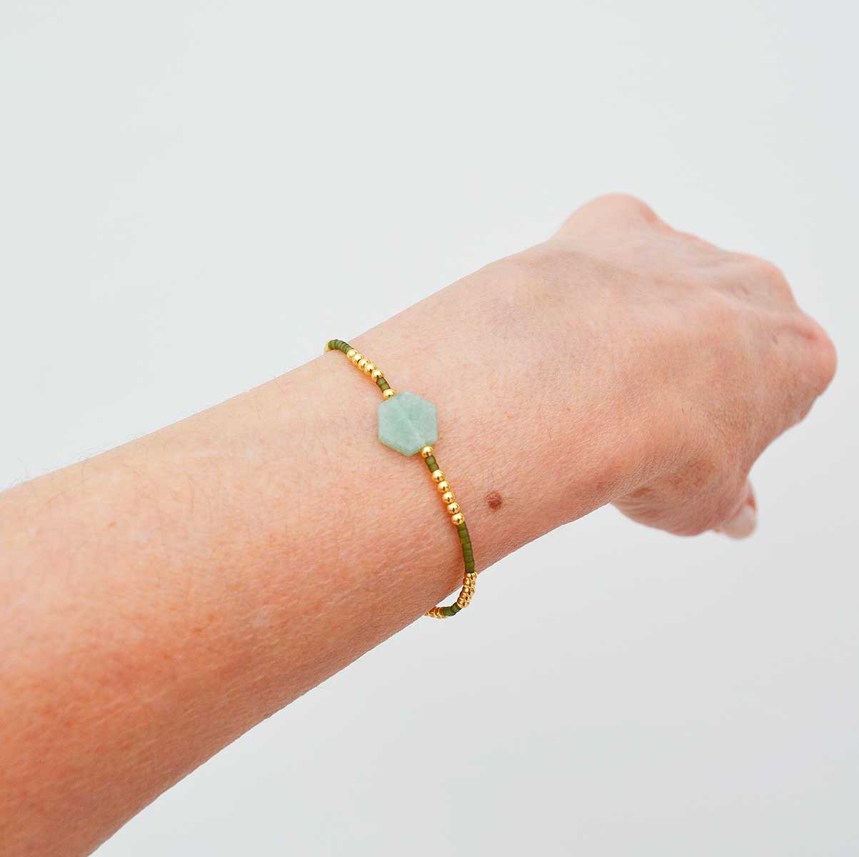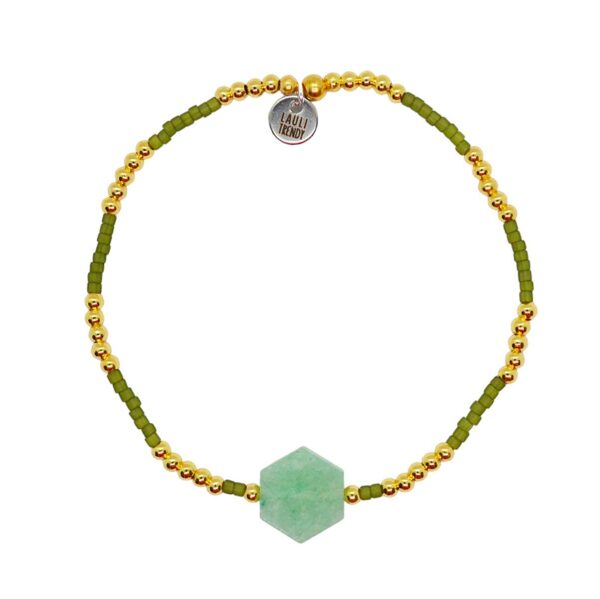 LโAventurine, pierre dโharmonie, sโallie aux perles dorรฉes ร lโor fin 18k et aux nuances mates du kaki pour un rendu ร la fois moderne et raffinรฉ.