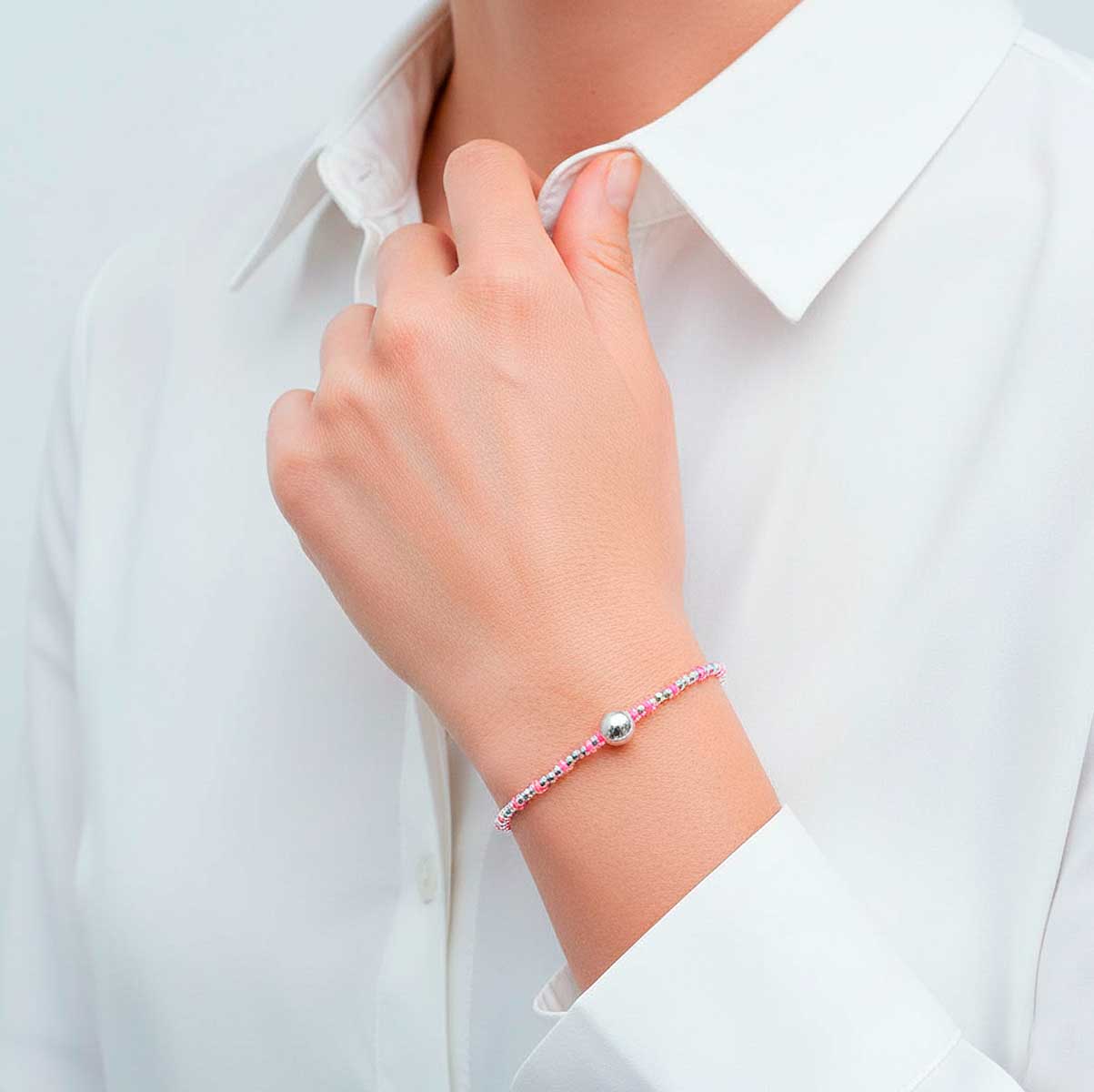 Le bracelet Olia 2 se compose de perles en argent 925 et de perles japonaises rose fushia, ponctuées d’une perle boule en argent qui capte la lumière avec justesse.