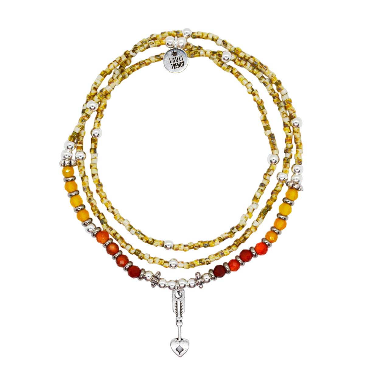 Chaque perle dessine un rythme naturel, rehaussé d’un pendentif flèche en argent pour une touche symbolique et moderne.